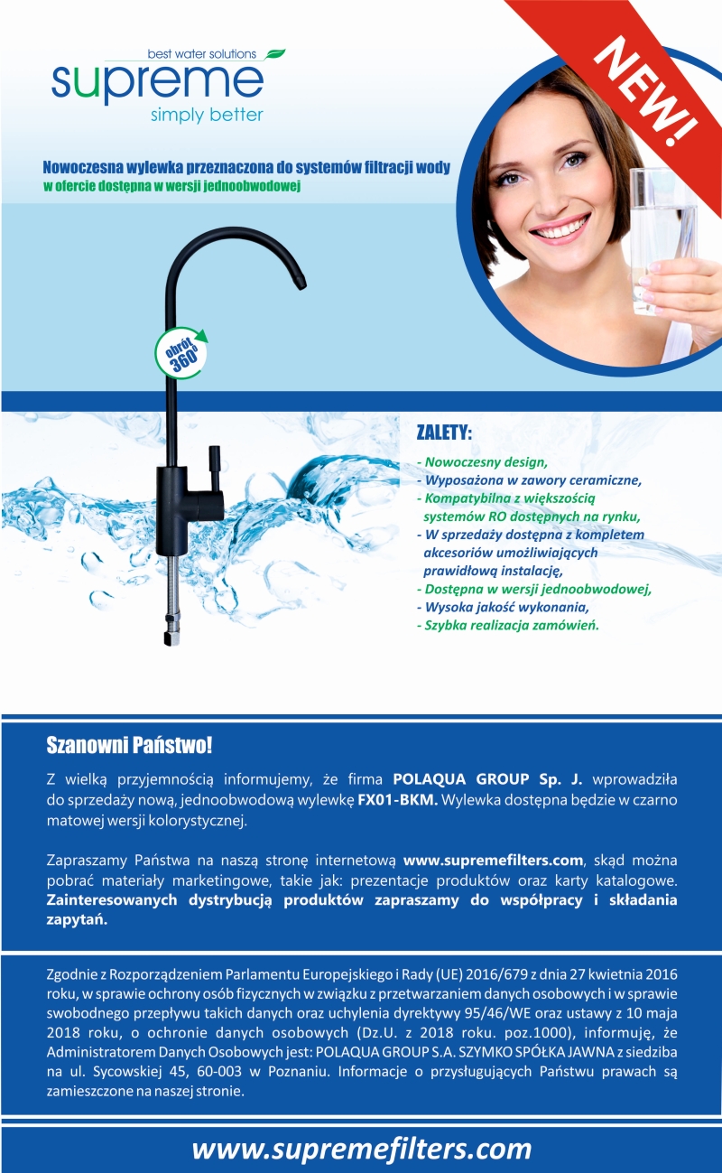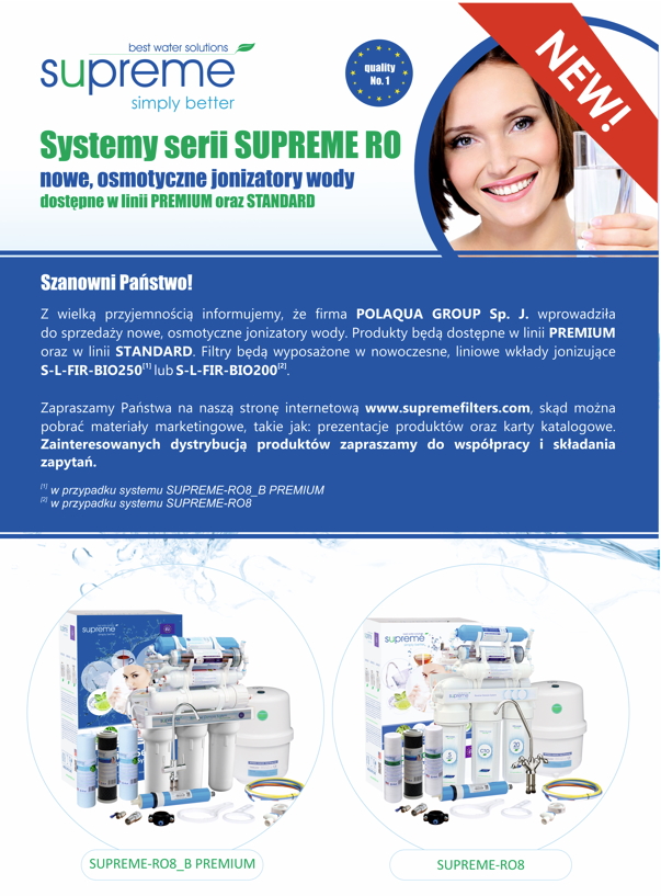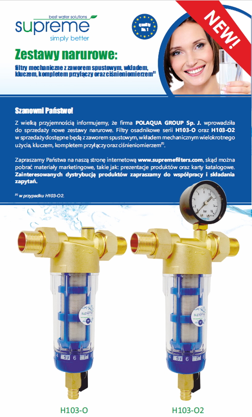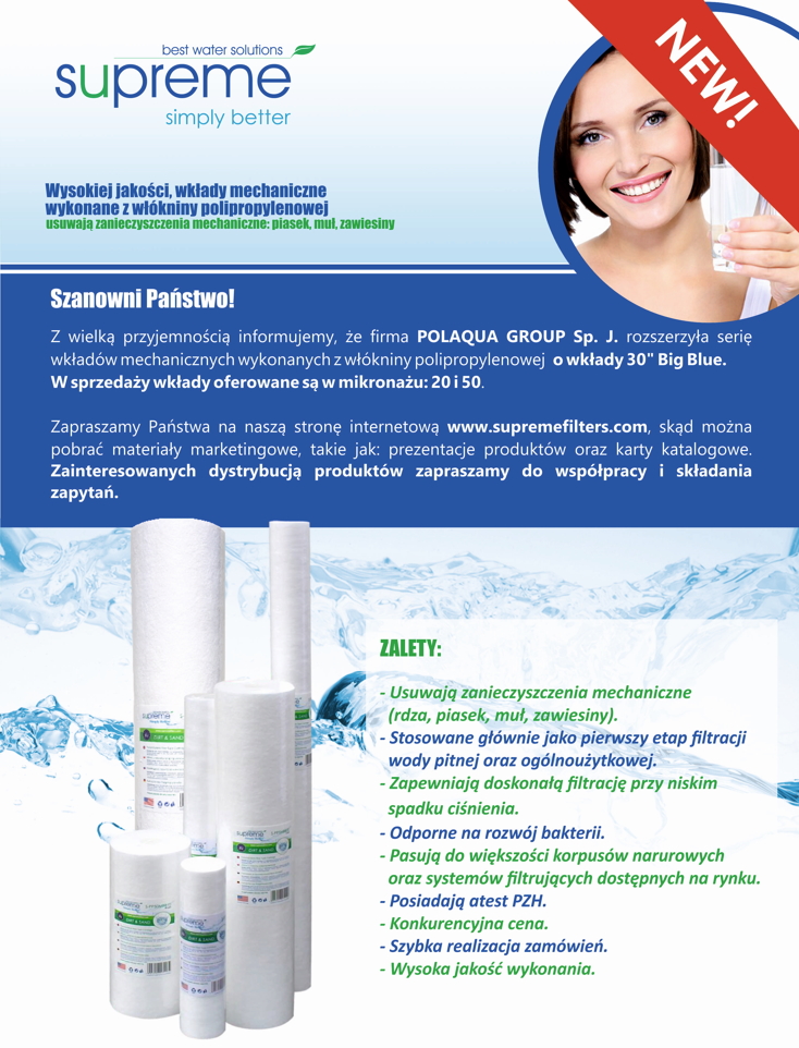 Szanowni Państwo! Z wielką przyjemnością informujemy, że firma POLAQUA GROUP Sp. J. wprowadziła do sprzedaży nowe zestawy narurowe. Filtry osadnikowe serii ...NOWOCZESNE, OSMOTYCZNE JONIZATORY WODY MARKI SUPREME