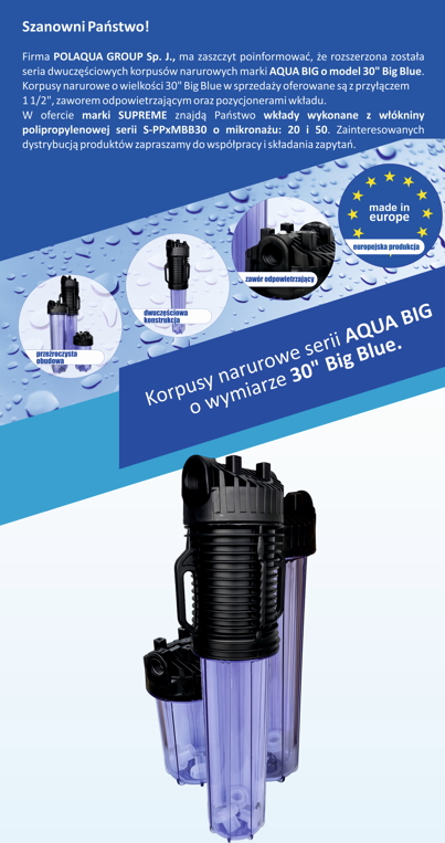 Z wielką przyjemnością informujemy, że firma POLAQUA GROUP Sp. J. rozszerzyła serię wkładów mechanicznych wykonanych z włókniny polipropylenowej marki SUPREME ...Korpusy narurowe serii AQUA BIG - 30" Big Blue